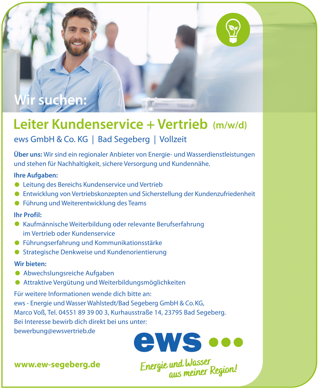 Wir suchen SIE! Werden Sie Teil unseres ews Teams in Bad Segeberg - wir freuen uns auf Ihre Bewerbung!
